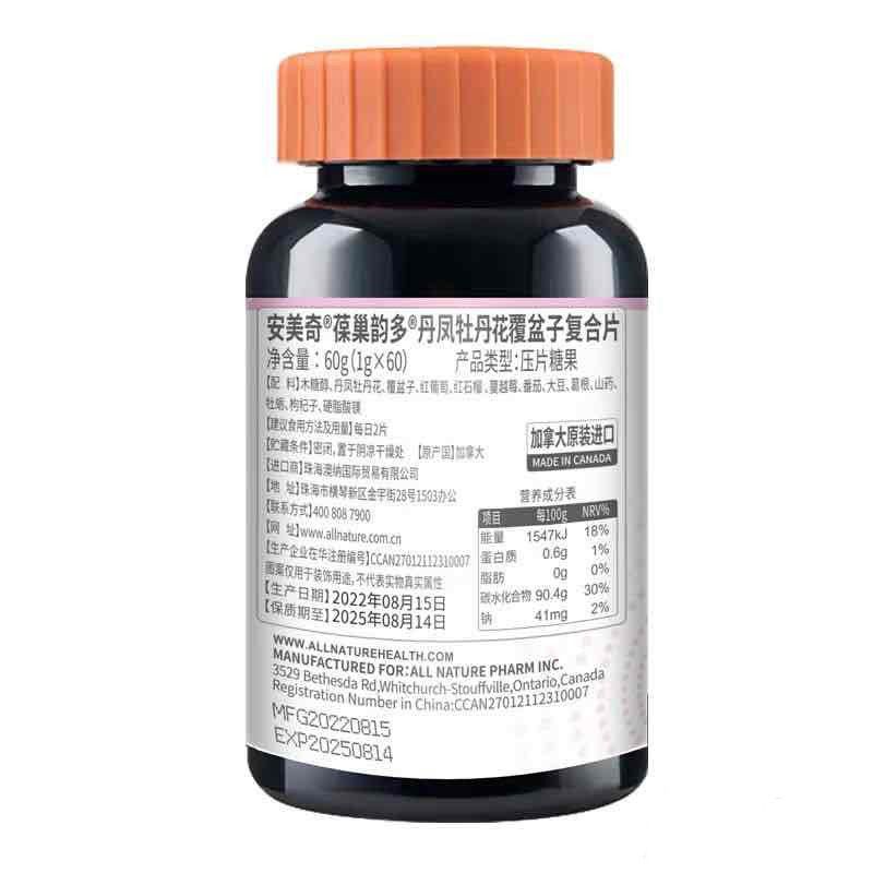 | 產(chǎn)品名稱 | 安美奇葆巢韻多丹鳳牡丹花覆盆子復合片 |