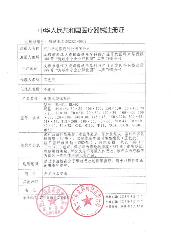 | 主要成分 | 該產品由外層基材、水膠體基質、保護層組成;臑榫郯滨ケ∧ぃ≒U膜),水膠體基質由丙烯酸酯膠(壓敏版)、羧甲基纖維素鈉(CMC-Na)、液體石蠟、聚乙二醇400在使用前去除。所含成分不可被人體吸收。該產品為經輻照滅菌的一次性使用的無菌產品八(PEG400)組成。保護層為滌綸樹脂膜(PET膜)或離型紙。 |