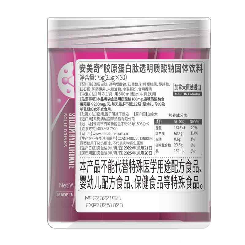 產(chǎn)品名稱: 安美奇膠原蛋白肽透明質(zhì)酸鈉固體飲料