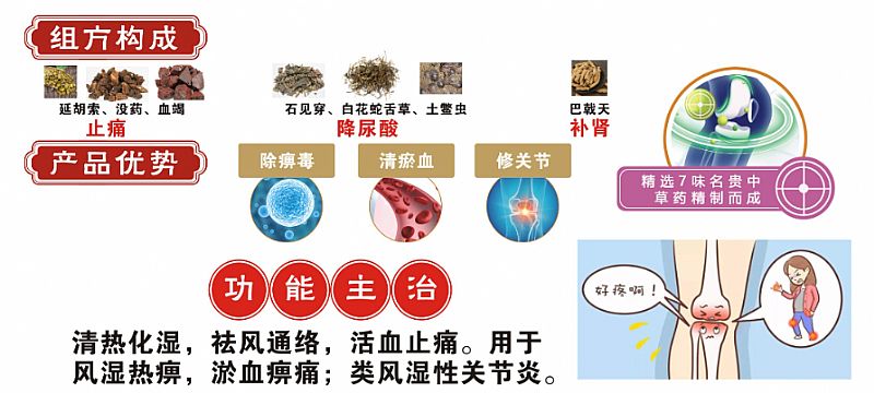 | 功能主治 | 清熱化濕,祛風(fēng)通絡(luò),活血止痛。用于風(fēng)濕熱痹,淤血痹痛;類(lèi)風(fēng)濕性關(guān)節(jié)炎。 |