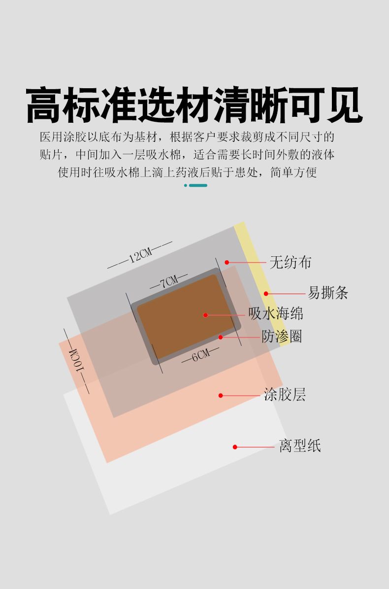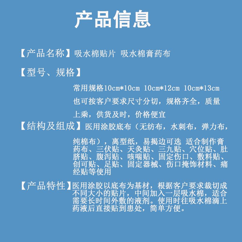 | 產(chǎn)品用途 | 通過吸水棉作為載體,外布起到固定作用,用于液體敷料貼敷在穴位處,適合需要液體貼敷穴位的場景 |