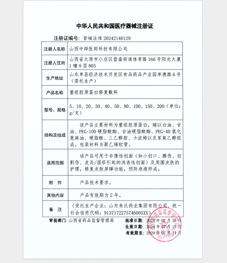 | 產(chǎn)品名稱 | 重組膠原蛋白修復(fù)輔料 |