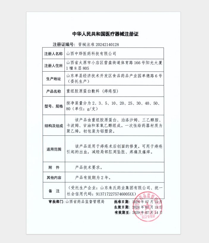產(chǎn)品名稱: 重組膠原蛋白敷料(痔瘡型)