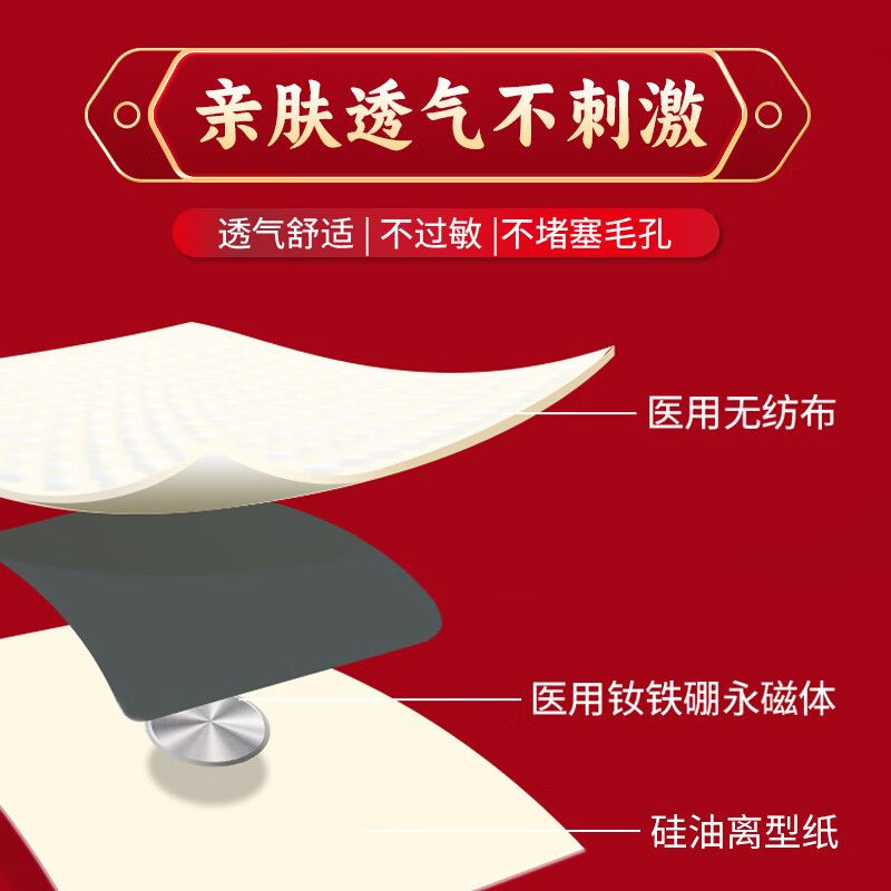| 主要成分 | 本品由無紡布、熱熔膠、磁片和離型紙組成。磁片為釹鐵硼永磁體,磁片1個/貼。 |