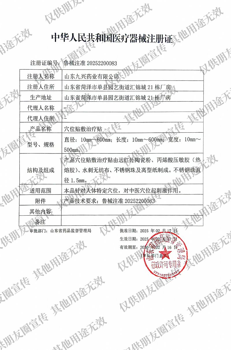 | 補(bǔ)充說明 | 【產(chǎn)品名稱】穴位貼敷治療貼 【型號(hào)規(guī)格】30mm×80mm 【結(jié)構(gòu)組成】該產(chǎn)品穴位貼政治療貼由遠(yuǎn)紅外陶瓷粉、丙烯酸壓敏膠(熱熔膠)、水刺無紡布、 不銹鋼珠及離型紙制成。不銹鋼珠直徑1.5m。 【產(chǎn)品性能】 不銹鋼珠直徑1 .5mm。穴位貼敢治療貼的壓敏膠布剝離強(qiáng)度不低于1.0N/cm,持粘性應(yīng)不大于2.5m, 穴位貼敷治療貼在8μm~15μm 波長(zhǎng)范圍的法向比輻射率不低于80%. 【使用說明】 1、清潔相應(yīng)穴位,先以拇指依次揉按相應(yīng)穴位,每穴1~2分鐘,范圍由小到大,力量由輕到重,探導(dǎo)敏感點(diǎn)。 2、確認(rèn)包裝無破損后,打開包裝,取出穴位貼敷治療貼,將貼劑的隔離膜撕去,以鋼珠對(duì)準(zhǔn)相應(yīng)穴位敏感點(diǎn)貼壓,1片/穴/天,每日適度按壓3~5次,每次3~5分鐘,1個(gè)療程為10天,療程間隔2~3天。 【適用范圍】本品針對(duì)人體特定穴位,對(duì)中醫(yī)穴位起刺激作用。 【注意事項(xiàng)】 1、僅限一次性使用,用后銷毀; 2、叮囑患者定時(shí)按壓,按壓不能過度用力,以不損傷皮膚為宜; 3、無粘性、包裝破損或過有效期禁止使用; 4、夏季多汗,宜助換; 5、貼后如有過敏等不適,應(yīng)停止數(shù)貼。 【慎用】糖尿病、高熱思者、皮膚敏感者。 【禁忌癥】孕婦、皮膚潰爛處禁用。 【儲(chǔ)存條件】本產(chǎn)品應(yīng)貯存在相對(duì)濕度不超過80%,無腐蝕性氣體、干燥、通風(fēng)良好、清潔的環(huán)境內(nèi)。 【產(chǎn)品技術(shù)要求】魯械注準(zhǔn)20252200083 【醫(yī)療器械注冊(cè)證號(hào)】魯械注準(zhǔn)20252200083 【醫(yī)療器械生產(chǎn)許可證號(hào)】魯藥監(jiān)械生產(chǎn)許20250030號(hào) |