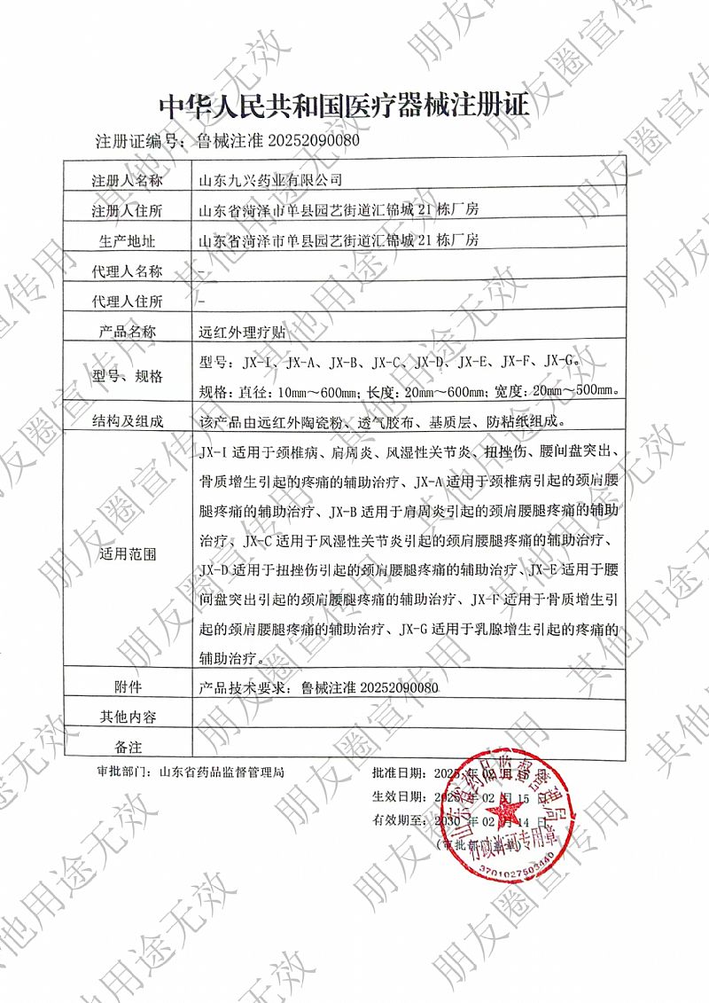 | 補充說明 | 【產品名稱】遠紅外理療貼 【型號規(guī)格】型號:JX-I、JX-A、JX-B、JX-C、JX-D、JX-E、JX-F、JX-G。規(guī)格:直徑:10mm~600mm;長度:20mm~600mm,寬度:20mm~500mm。 【結構組成】該產品由遠紅外陶瓷粉、透氣膠布、基質層、防粘紙組成。 【產品性能】剝離強度不小于1.0N/cm,持粘性不大于2.5mm、遠紅外理療貼在8μm~15μm波長范圍的法向比輻射率不低于80%。 【禁忌癥】裝有心臟起搏器患者,出血傾向性疾病患者,嚴重的心、肝、肺、腎衰竭的患者,局部皮膚破損感染者,孕婦及過敏體質者禁用。 【治療部位】JX-I型號適用于全身部位;JX-A型號適用于頸椎部位和頸肩腰腿的疼痛部位;JX-B型號適用于肩部和頸肩腰腿的疼痛部位;JX-C型號適用于關節(jié)部位和頸肩腰腿的疼痛部位;JX-D型號適用于踝、腕關節(jié)和頸肩腰腿的疼痛部位;JX-E型號適用于腰部和頸肩腰腿的疼痛部位;JX-F型號適用于骨質增生部位和和頸肩腰腿的疼痛部位;JX-G型號適用于乳房外側。 【使用說明】清潔患處,確認包裝無破損后,打開包裝,將貼劑的隔離膜撕去,貼于患處,每24~72小時更換一次。累計*長貼敷時間為21天。 【注意事項、警示以及提示的內容】 1、建議在醫(yī)生指導下使用。 2、惡性腫瘤患者、精神障礙疾病患者、體質極度虛弱者使用應遵醫(yī)囑。 3、僅限一次性使用,用后銷毀。 4、包裝如有破損,嚴禁使用。 5、使用時嚴格按照使用說明進行。 |