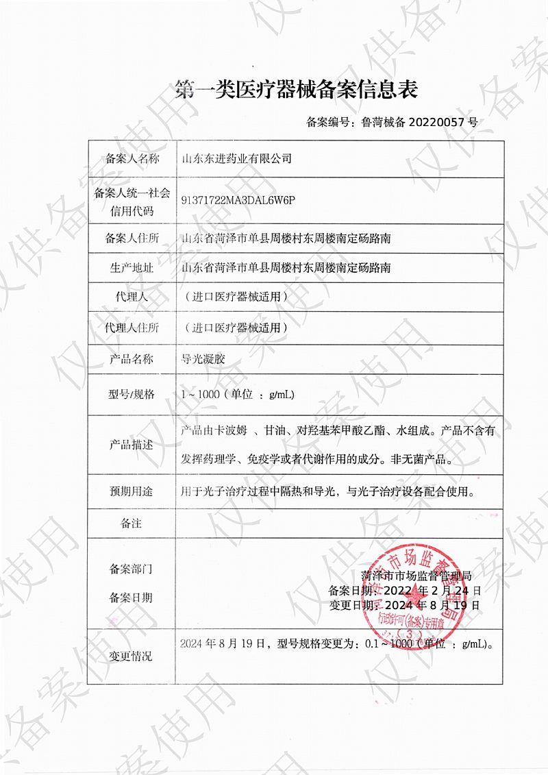| 補(bǔ)充說(shuō)明 | 【產(chǎn)品名稱(chēng)】導(dǎo)光凝膠 【型號(hào)規(guī)格】50g 【產(chǎn)品描述】產(chǎn)品由卡波姆、甘油、對(duì)羥基苯甲酸乙酯、水組成。產(chǎn)品不含有發(fā)揮藥理學(xué)、免疫學(xué)或者代謝作用的成分。非無(wú)菌產(chǎn)品。 【預(yù)期用途】用于光子治療過(guò)程中隔熱和導(dǎo)光,與光子治療設(shè)備配合使用。 【使用方法】外用,直接涂抹于患處。 【注意事項(xiàng)】 1、本品不屬于藥品; 2、本品外用禁口服; 3、過(guò)敏體質(zhì)者慎用; 4、皮膚有開(kāi)放性傷口、化膿或有明顯滲出者禁用; 5、請(qǐng)將本品放在兒童不能接觸的地方; 6、本品性狀發(fā)生改變時(shí)禁止使用; 7、使用本品后有不適癥狀者應(yīng)停止使用或向醫(yī)生咨詢。 【禁忌癥】對(duì)本品成分過(guò)敏者禁用。 【儲(chǔ)存條件】密封、常溫下貯存和運(yùn)輸,運(yùn)輸過(guò)程中輕拿輕放。 【備案憑證編號(hào)】魯菏械備20220057號(hào) 【產(chǎn)品技術(shù)要求編號(hào)】魯菏械備20220057號(hào) 【生產(chǎn)備案憑證編號(hào)】魯菏食藥監(jiān)械生產(chǎn)備20170002號(hào) |