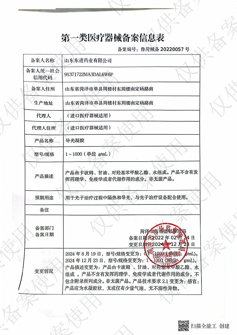| 補(bǔ)充說(shuō)明 | 【產(chǎn)品名稱】導(dǎo)光凝膠 【型號(hào)規(guī)格】35g/瓶×1瓶/盒 【產(chǎn)品描述】產(chǎn)品由卡波姆、甘油、對(duì)羥基苯甲酸乙酯、水組成。產(chǎn)品不含有發(fā)揮藥理學(xué)、免疫學(xué)或者代謝作用的成分。非無(wú)菌產(chǎn)品。 【預(yù)期用途】用于光子治療過(guò)程中隔熱和導(dǎo)光,與光子治療設(shè)備配合使用。 【使用方法】外用,直接涂抹于患處。 【注意事項(xiàng)】 1、本品不屬于藥品; 2、 本品外用禁口服; 3、過(guò)敏體質(zhì)者慎用; 4、 皮膚有開放性傷口、化膿或有明顯滲出者禁用; 5、 請(qǐng)將本品放在兒童不能接觸的地方; 6、 本品性狀發(fā)生改變時(shí)禁止使用; 7、 使用本品后有不適癥狀者應(yīng)停止使用或向醫(yī)生咨詢。 【禁忌癥】對(duì)本品成分過(guò)敏者禁用。 【儲(chǔ)存條件】密封、常溫下貯存和運(yùn)輸,運(yùn)輸過(guò)程中輕拿輕放。 |