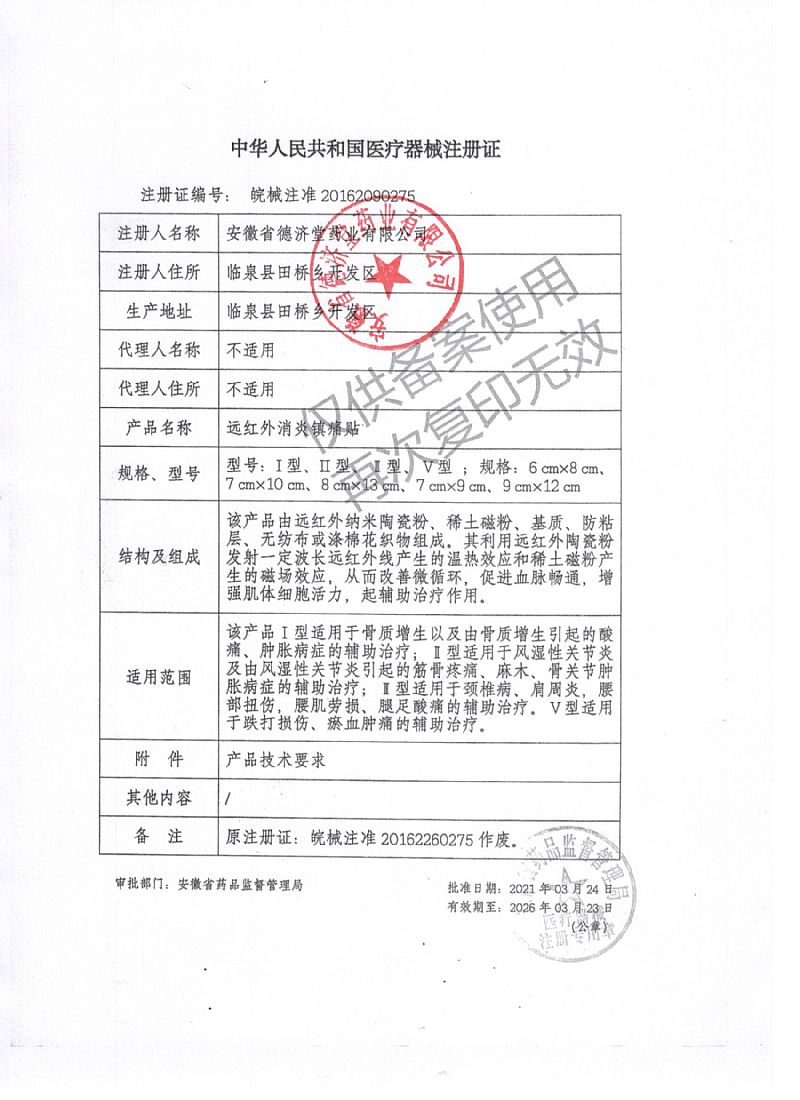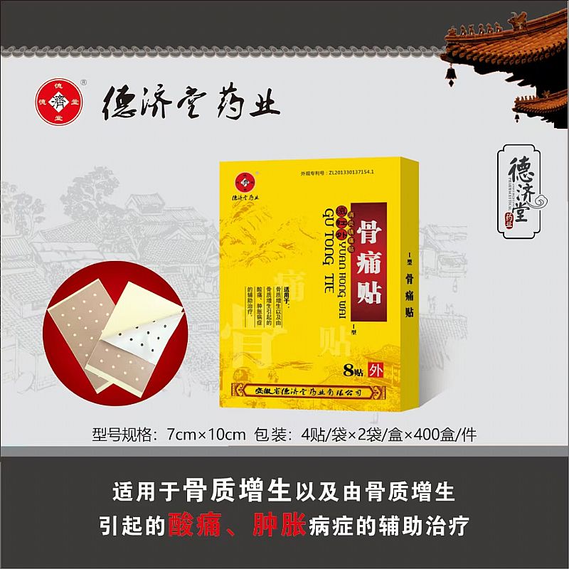 | 產(chǎn)品用途 | I型骨痛貼:適用于骨質(zhì)增生以及由骨質(zhì)增生引起的酸痛、腫脹病癥的輔助治療。 II型風(fēng)濕痛貼:適用于風(fēng)濕性關(guān)節(jié)炎及由風(fēng)濕性關(guān)節(jié)炎引起的筋骨疼痛、麻木、骨關(guān)節(jié)腫脹病癥的輔助治療。 III型頸肩腰腿痛貼:適用于頸椎病、肩周炎,腰部扭傷,腰肌勞損、腿足酸痛病癥的輔助治療。 V型跌打損傷貼:適用于跌打損傷,瘀血腫痛的輔助治療。 |