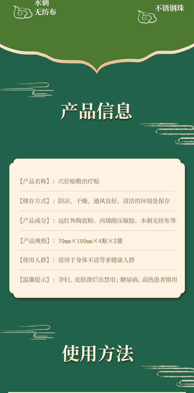 | 使用方法 | 1、清潔相應(yīng)穴位,先以拇指依次揉按相應(yīng)穴位,每穴1~2分鐘,范圍由小到大,力量由輕到重,探尋敏感點(diǎn)。2、確認(rèn)包裝無破損后,打開包裝,取出穴位貼敷治療貼,將貼劑的隔離膜撕去,以鋼珠對準(zhǔn)相應(yīng)穴位敏感點(diǎn)貼壓,1片/穴、天,每日適度按壓3~5次,每次3~5分鐘,1個(gè)療程為10天,療程間隔2~3天 |