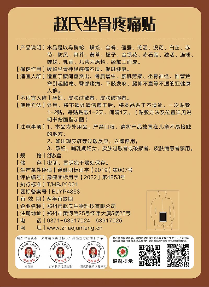 | 補(bǔ)充說明 | 【產(chǎn)品說明】本品是以烏梢蛇、蜈蚣、全蝎、僵蠶、羌活、沒藥、白芷、赤芍、防風(fēng)、荊芥、黃芩、梔子、金銀花、赤石脂、獨(dú)活、連翹、蟬蛻、乳香、兒茶為原料、經(jīng)加工而成。 【保健作用】緩解坐骨神經(jīng)疼痛不適,促進(jìn)健康。 【適宜人群】適宜于腰間盤突出、骨質(zhì)增生、腰肌勞損、坐骨神經(jīng)、椎管狹窄引起腿痛、臀部疼痛、下肢發(fā)麻、腿伸不直等不適的亞健康人群。 【不適宜人群】孕婦、皮膚過敏者、皮膚破損者。 【使用方法】外用,將不適處清潔擦干后,將本品貼于不適處,一次貼敷1-2貼,每貼貼敷1-2天,間隔1天。(貼敷方法及位置詳見說明書背面指示圖) 【注意事項(xiàng)】1、本品為外用品,嚴(yán)禁口服,請(qǐng)將產(chǎn)品放置在兒童不易接觸的地方; 2、如出現(xiàn)皮疹等過敏反應(yīng),立即停用; 3、孕婦,哺乳期婦女,皮膚過敏者或破損者,皮膚病患者禁用。 【規(guī) 格】2貼/盒 【儲(chǔ) 存】密閉、置陰涼干燥處保存。 【生產(chǎn)條件評(píng)估】豫健團(tuán)標(biāo)證字【2019】第007號(hào) 【評(píng)估編號(hào)】豫健團(tuán)標(biāo)用字【2022】第4853號(hào) 【執(zhí)行標(biāo)準(zhǔn)】T/HBJY 001 【團(tuán)標(biāo)備案號(hào)】BJYP4853 【有效期】?jī)赡暧行?br>【企業(yè)名稱】鄭州市趙氏生物科技有限公司 【注冊(cè)地址】鄭州市黃河路25號(hào)經(jīng)津大廈5樓25號(hào) |