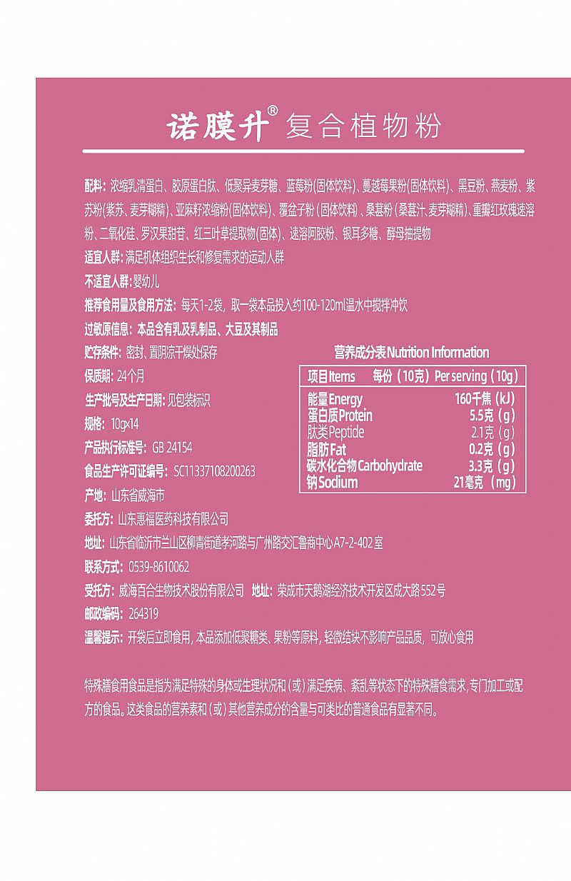 | 主要成分 | 濃縮乳清蛋白、膠原蛋白肽、低聚異麥芽糖、藍莓粉(固體飲料)、蔓越莓果粉(固體飲料)、黑豆粉、燕麥粉、紫蘇粉(紫蘇、麥芽糊精)、亞麻籽濃縮粉(固體飲料)、覆盆子粉(固體飲料)、桑葚粉(桑葚汁、麥芽糊精)、重瓣紅玫瑰速溶粉、二氧化硅、羅漢果甜苷、紅三葉草提取物(固體)、速溶阿膠粉、銀耳多糖、酵母抽提物 |