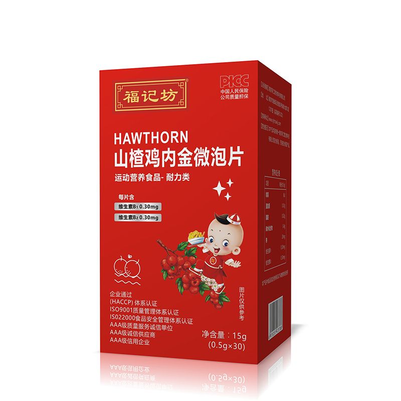 | 主要成分 | 山梨糖醇,赤蘚糖醇,檸檬酸,碳酸氫鈉,山楂粉(5%),雞內(nèi)金粉(5%),硬脂酸鎂,三氨蔗糖,食用香精,維生素B1,維生素B2。 |