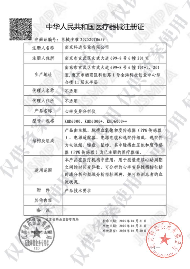 | 產(chǎn)品用途 | 本產(chǎn)品在醫(yī)療機構(gòu)中使用,用于測量連續(xù)心動周期之間的時間變異數(shù),可分析的心率變異性指標(biāo)包括時域分析和頻域分析指標(biāo)兩種。并可檢測患者的血流狀況。 |