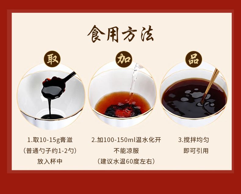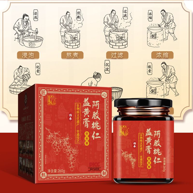 | 補充說明 | 阿膠桃仁益黃膏,以“旗黃膏熬制技藝”為核心,嚴(yán)選阿膠、桃仁、西洋參、當(dāng)歸、桑葚、枸杞子、核桃仁等八味道地食材,佐以天然低聚異麥芽糖,經(jīng)72小時制。 |