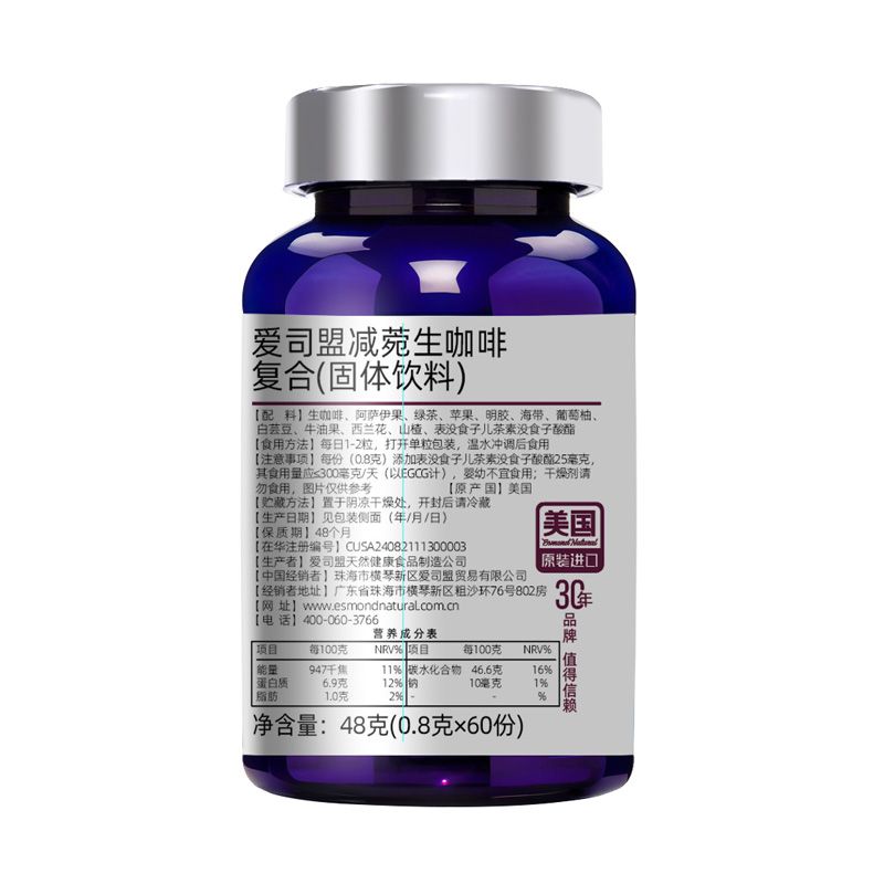 產(chǎn)品名稱: 愛司盟減菀生咖啡復合(固體飲料)