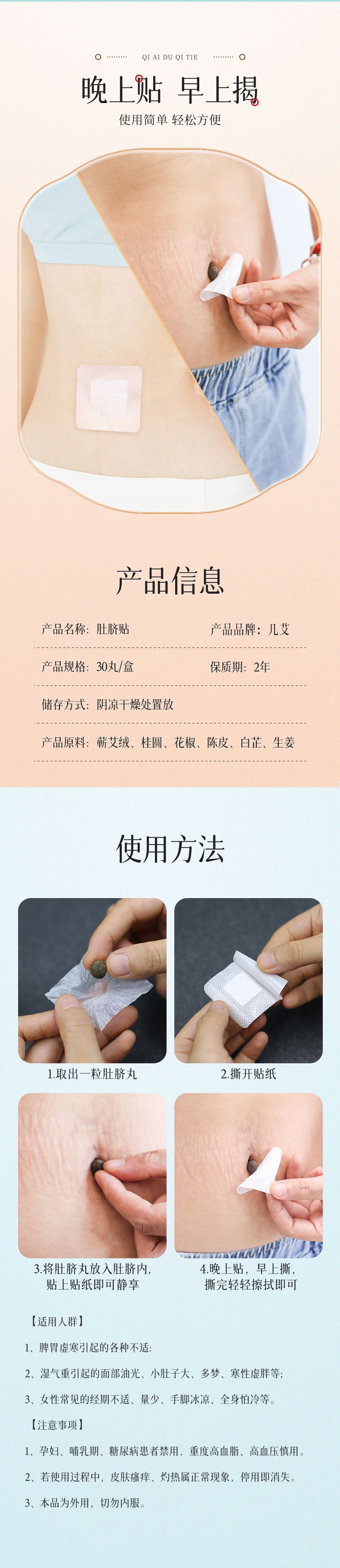 | 使用方法 | 取出艾臍丸,艾臍丸放入膠圈,對(duì)準(zhǔn)肚臍貼入;壓扁可貼于涌泉穴 |