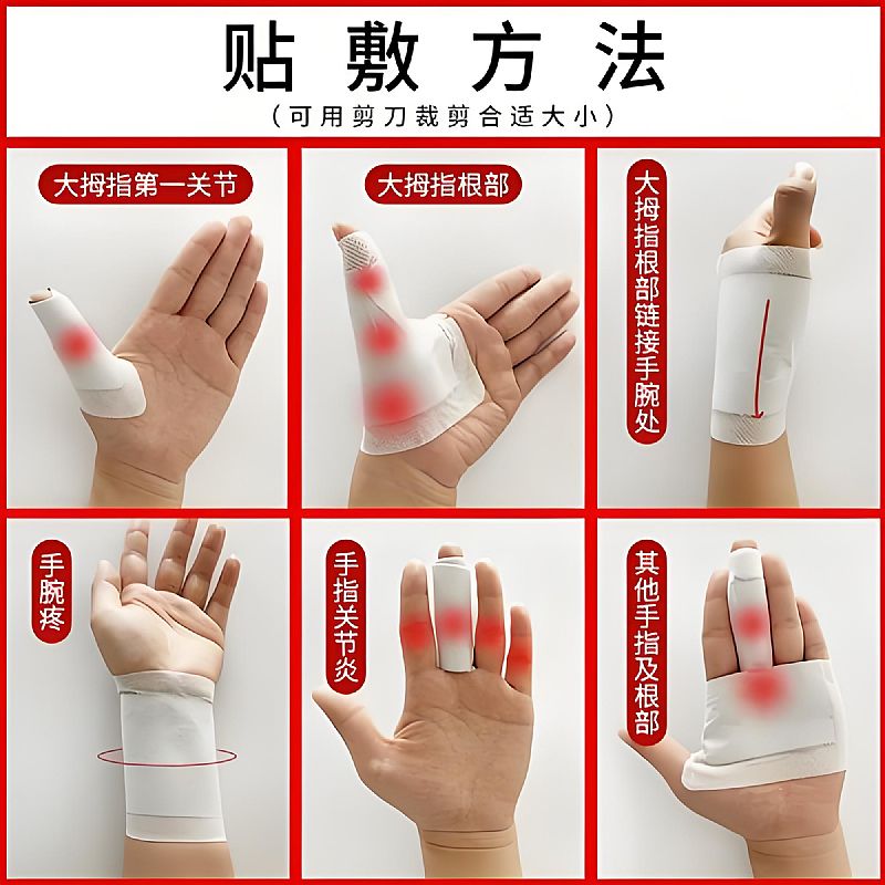 | 使用方法 | 清潔疼痛部位皮膚,擦干后揭開貼劑保護膜; 對準疼痛中心(如手腕橈骨莖突、手指關節(jié)處)貼敷,輕輕按壓使膏體與皮膚緊密貼合; 每貼建議貼敷8-12小時,每日1次,急性疼痛期可每日2次(間隔4小時),20天為一療程; 揭下時緩慢輕柔,避免拉扯皮膚,敏感肌膚可縮短貼敷時間或間隔使用。 |