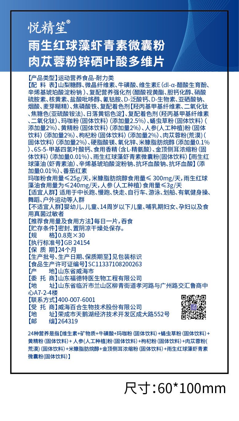 | 產(chǎn)品名稱 | 悅精笙雨生紅球藻蝦青素微囊粉肉蓯蓉粉鋅硒葉酸多維片 |