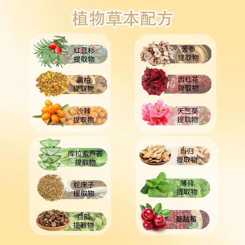 | 主要成分 | 膠原蛋白肽、生物肽、玫瑰精油、紅豆杉提取物、沙棘提取物、庫(kù)拉索蘆薈提取物、蛇床子提取物、黃柏提取物、苦參提取物、當(dāng)歸提取物、西紅花提取物、天竺葵提取物、百部提取物、蔓越莓、薄荷提取物、三氯生。 |