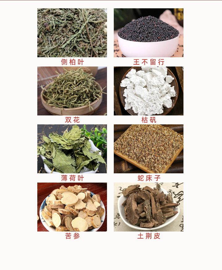 | 主要成分 | 王不留行、枯礬、側(cè)柏葉、雙花、苦參、龍腦等 |