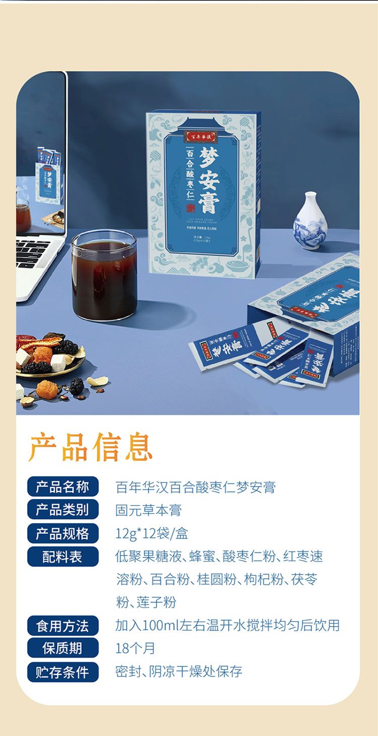 | 主要成分 | 酸棗仁百合茯苓紅棗桂圓枸杞鏈子蜂蜜益生元 |