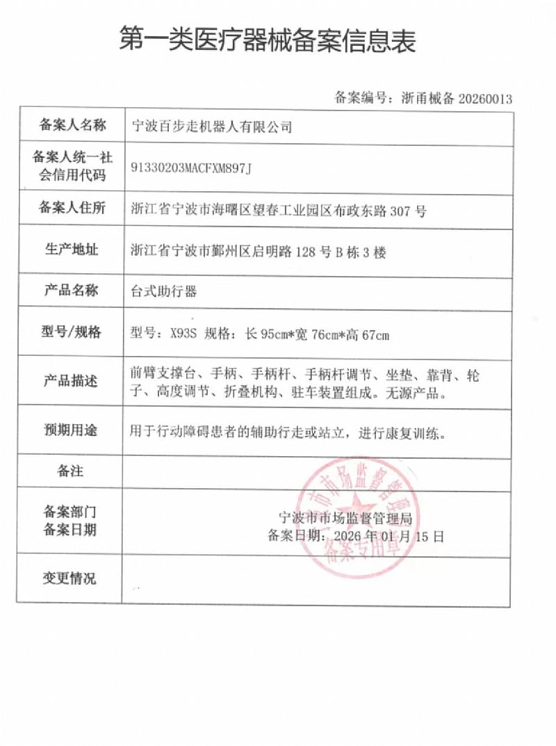 | 補(bǔ)充說明 | “百步走”外骨骼助行器為一類醫(yī)療器械,分為無(wú)源基版與有源增強(qiáng)版,采用仿生外骨骼設(shè)計(jì),貼合下肢生理結(jié)構(gòu),適配不同需求的助行與康復(fù)場(chǎng)景。 核心優(yōu)勢(shì) -無(wú)源基版:純機(jī)械結(jié)構(gòu),無(wú)電機(jī)/電池,零維護(hù)、成本低,輕便易折疊,適合居家、社區(qū)日常使用。 -有源增強(qiáng)版:搭載動(dòng)力驅(qū)動(dòng)模塊,智能傳感實(shí)時(shí)監(jiān)測(cè)步態(tài),提供精準(zhǔn)助力,減少行走耗能,適配專業(yè)康復(fù)機(jī)構(gòu)與重度行動(dòng)障礙人群。 臨床反饋 產(chǎn)品經(jīng)多家康復(fù)機(jī)構(gòu)驗(yàn)證,可有效提升用戶行走穩(wěn)定性,降低跌倒風(fēng)險(xiǎn),有源版助力效率提升,適合長(zhǎng)期使用。 無(wú)源版適用于輕度行動(dòng)不便人群輔助行走、分擔(dān)體重;有源版適用于中重度行動(dòng)障礙人群提供主動(dòng)動(dòng)力助力、改善步態(tài) - |