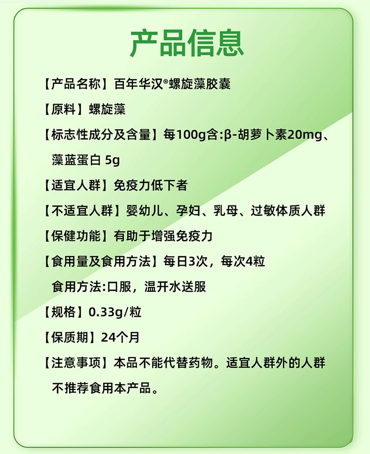 產(chǎn)品名稱(chēng): 百年華漢螺旋藻膠囊免疫力源頭工廠