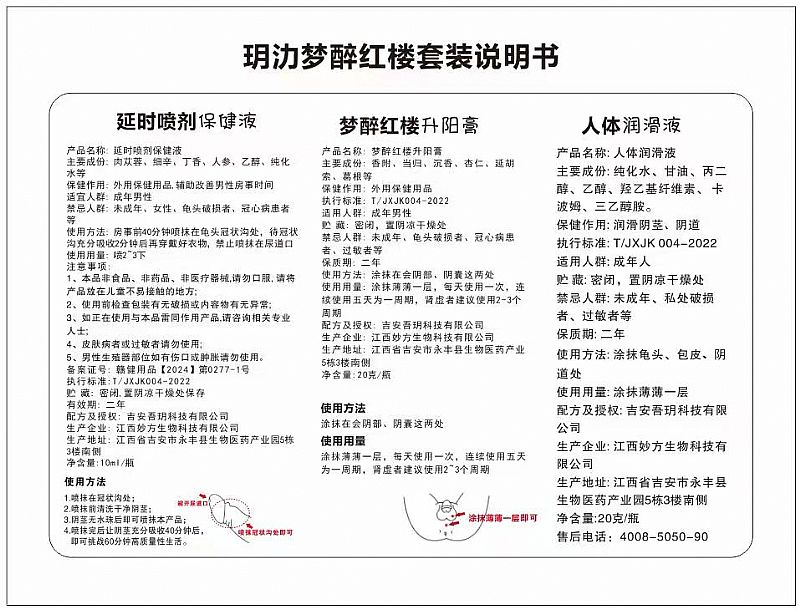 | 補(bǔ)充說明 | 延時(shí)噴劑保健液 產(chǎn)品名稱:延時(shí)噴劑保健液 主要成份:肉蓯蓉、細(xì)辛、丁香、人參、乙醇、純化水等 保健作用:外用保健用品.輔助改善男性房事時(shí)間 適宜人群:成年男性禁忌人群:未成年、女性、龜頭破損者、冠心病患者 使用方法:房事前40分鐘噴抹在龜頭冠狀溝處,待冠狀溝充分吸收2分鐘后再穿戴好衣物,禁止噴抹在尿道口使用用量:噴2~3下 注意事項(xiàng): 1、本品非食品、非藥品、非醫(yī)療器械.請勿口服.請將產(chǎn)品放在兒童不易接觸的地方; 2、使用前檢查包裝有無破損或內(nèi)容物有無異常; 3、如正在使用與本品雷同作用產(chǎn)品,請咨詢相關(guān)專業(yè)人士; 4、皮膚病者或過敏者請勿使用; 5、男性生殖器部位如有傷口或腫脹請勿使用。 備案證號(hào):贛健用品【2024】第0277-1號(hào) 執(zhí)行標(biāo)準(zhǔn):T/JXJK004-2022 貯藏:密閉,置陰涼干燥處保存 有效期:二年 配方及授權(quán):吉安吾玥科技有限公司 生產(chǎn)企業(yè):江西妙方生物科技有限公司 生產(chǎn)地址:江西省吉安市永豐縣生物醫(yī)藥產(chǎn)業(yè)園5棟3樓南側(cè) 凈含量:10m1/瓶 使用方法 1.噴抹在冠狀溝處; 2.噴抹前清洗干凈陰莖: 3.陰莖無水珠后即可噴抹本產(chǎn)品; 4.噴抹完后讓陰莖充分吸收40分鐘后,可挑戰(zhàn)60分鐘高質(zhì)量性生活 夢醉紅樓升陽膏 產(chǎn)品名稱:夢醉紅樓升陽膏主要成份:香附、當(dāng)歸、沉香、杏仁、延胡索、葛根等 保健作用:外用保健用品 執(zhí)行標(biāo)準(zhǔn):T/JXJK004-2022 適用人群:成年男性 貯藏:密閉,置陰涼干燥處 禁忌人群:未成年、龜頭破損者、冠心病患者、過敏者等 保質(zhì)期:二年 使用方法:涂抹在會(huì)陰部、陰囊這兩處使用用量:涂抹薄薄一層,每天使用一次,連續(xù)使用五天為一周期,腎虛者建議使用2-3個(gè)周期 配方及授權(quán):吉安吾玥科技有限公司 生產(chǎn)企業(yè):江西妙方生物科技有限公司 生產(chǎn)地址:江西省吉安市永豐縣生物醫(yī)藥產(chǎn)業(yè)5棟3樓南側(cè) 凈含量:20克/瓶 使用方法:涂抹在會(huì)陰部、陰囊這兩處使用用量涂抹薄薄一層,每天使用一次,連續(xù)使用五天為一周期,腎虛者建議使用2~3個(gè)周期 人體潤滑液 產(chǎn)品名稱:人體潤滑液 主要成份:純化水、甘油、丙二醇、乙醇、羥乙基纖維素、卡波姆、三乙醇胺。 保健作用:潤滑陰莖、陰道 執(zhí)行標(biāo)準(zhǔn):T/JXJK004-2022 適用人群:成年人 貯藏:密閉,置陰涼干燥處 禁忌人群:未成年、私處破損者、過敏者等 保質(zhì)期:二年 使用方法:涂抹龜頭、包皮、陰道處 使用用量:涂抹薄薄一層配方及授權(quán):吉安吾玥科技有限公司 生產(chǎn)企業(yè):江西妙方生物科技有限公司 生產(chǎn)地址:江西省吉安市永豐縣生物醫(yī)藥產(chǎn)業(yè)園5棟3樓南側(cè) 凈含量:20克/瓶 |