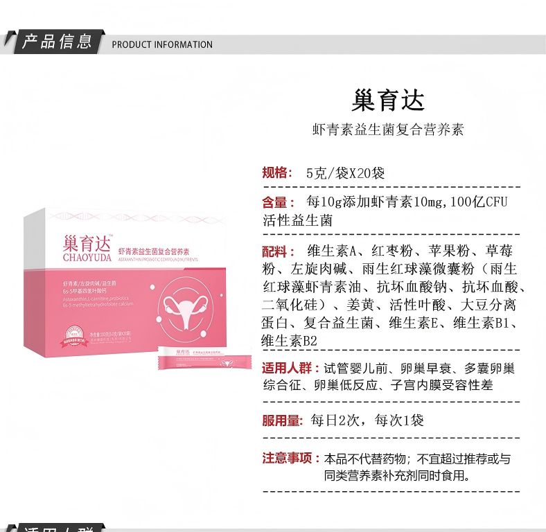 | 產(chǎn)品名稱 | 巢育達(dá)蝦青素益生菌復(fù)合營養(yǎng)素 |